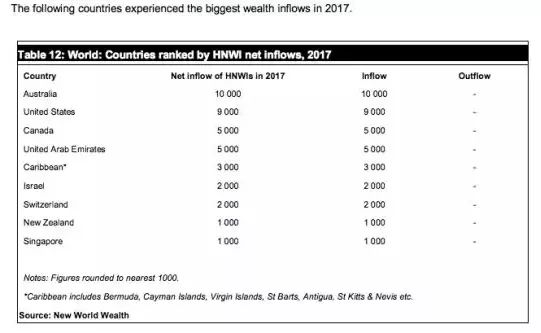 报告显示,2017年澳大利亚再度成为吸引高净值移民人数最多的国家。一共有1万名净资产达到100万美金以上的人选择移民澳大利亚,排在第二位的是美国,共吸引了9000名高净值人士。