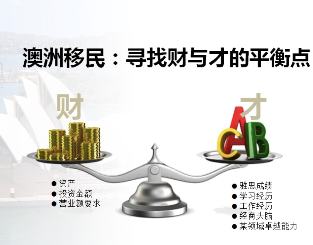 说起澳大利亚移民项目,其实一直是在寻找“才”与“财”之间的平衡点。“财”包括个人/家庭资产,投资金额,公司营业额要求等。“才”包括英文雅思成绩,学习经历,工作经历,经商头脑或者说在某领域的卓越能力。