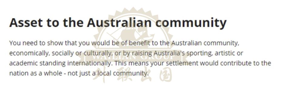 您需要证明您对澳大利亚社区,经济,社会或者文化,或是会带动澳大利亚体育,艺术或学术方面在国际上的影响力。这意味着当您在澳大利亚定居后会给整个澳大利亚国家,不仅仅是当地的社区带来贡献。