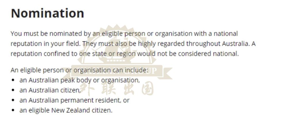 您须被一位在您的领域中具有国际资质的人或者机构提名。他们也必须在澳大利亚范围内被高度认可,但若仅仅是一个州或者一个地区那是不能被认为是澳大利亚国家范围内的。