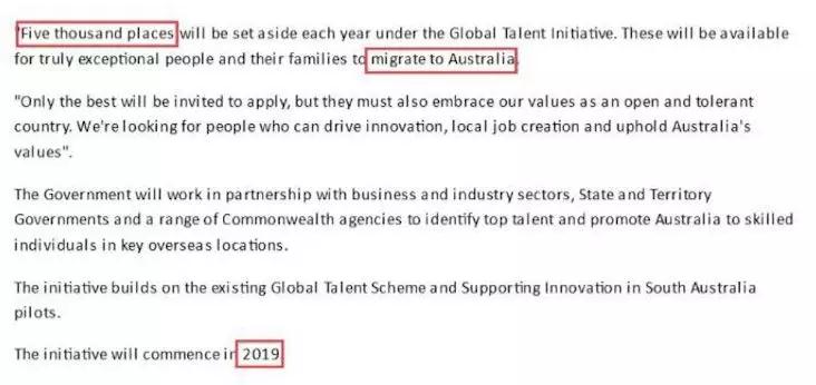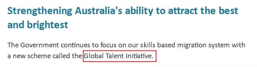 Global Talent Initiative主要是在全球范围内挑选出类拔萃的人才,促进澳洲经济进一步增长和繁荣。该 Initiative目前还在酝酿中,为保证其顺利实施和运行,政府为此投资1290万澳元。