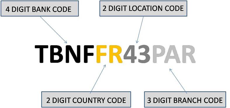 一般说,SWIFT Code是8位或者11位数字,由4位机构代码、2位国家代码、2位位置代码(银行分行所在城市位置代码,其中如果该位置代码中的第二个代码为0,标示为试用码;该代码为1,则标示为在SWIFT网络中被动参与者;如果该代码为2,则表明是到付的商业身份号码,标示收款方会支付该信息费用)和3位分支机构代码(可选项的)。