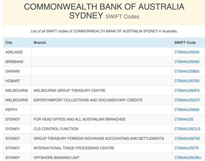 我们澳洲普睿德律师事务所使用的是澳大利亚联邦银行,其全部SWIFT Code清单如下:
