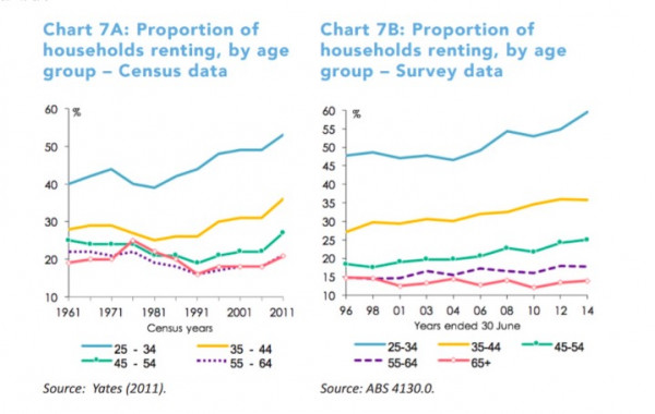 根据澳大利亚统计局的调查显示,45岁-50岁年龄段的家庭,在1995-96年之间居住在租赁房屋中的比例为18.4%。而在2013-14年,这一比例已经上涨了约三分之一至25%。Eslake表示未来几十年,退休人员住在租赁房屋中的比例可能会更高。