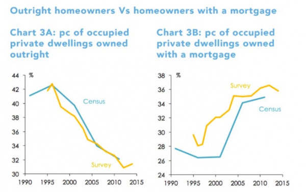 同时以下两图显示了调查的澳洲私人住宅房产所有权的两种情况,拥有完全所有权(无房贷)的比率(左)和仍背负房贷的所有权比率(右)。