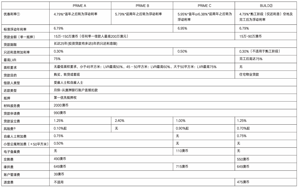 Build为买地建房贷款,仅限澳大利亚首府城市(不包括塔斯马尼亚)。贷款期限、只还利息期限、浮动利率与PrimeA&B相同, 施工阶段(仅还利息)可享受4.79% 优惠,完工后才转为浮动利率。