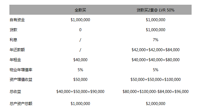 下表对比了全款购买价值为100万澳币物业和利用贷款购买200万澳币物业的回报情况: