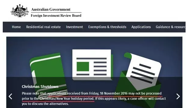 根据公告内容,FIRB将会在今年圣诞节和新年期间暂停工作!自11月18日(周五)开始,收到了所有申请,将不会在圣诞节和新年期间进行审理。如果有人的申请是在今年圣诞以及新年期间递交的,则有FIRB专人与您联系,另行安排时间进行审批。