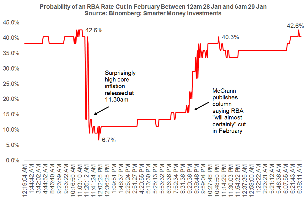 然而在周三晚上9点左右,基于月间平均基准利率的2月银行同业拆息期货合约的价格突然暴涨。同时,澳洲报纸Herald Sun发布了专栏文章称几乎可以肯定澳洲联储会选择在2月降息。到当晚10点左右,合约价格暗示澳洲联储在2月会议上将利率从2.5%下调至2.25%的概率又重新回升到40%以上。