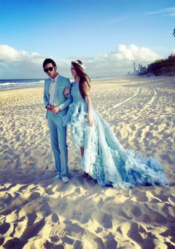 昆凌和周杰伦身穿水蓝色礼服,与黄金海岸的蓝天大海完美搭配~!