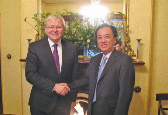 陆克文总理表示,近年来澳中关系发展得很好,澳方高度重视发展对华关系,看重中国在亚太地区乃至世界上的重要作用,希望进一步推进两国在政治、经贸、科技、教育、文化等各个领域及多边事务中的合作,包括中澳自由贸易协定谈判进程,推动双边关系面向长远持续发展,具备更丰富的战略内涵。