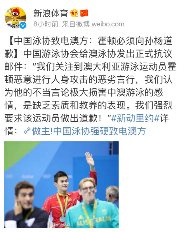 针对霍顿(Holden)对孙杨进行的人身攻击,中国游泳协会已经正式致电澳大利亚游泳协会,要求霍顿向孙杨道歉。