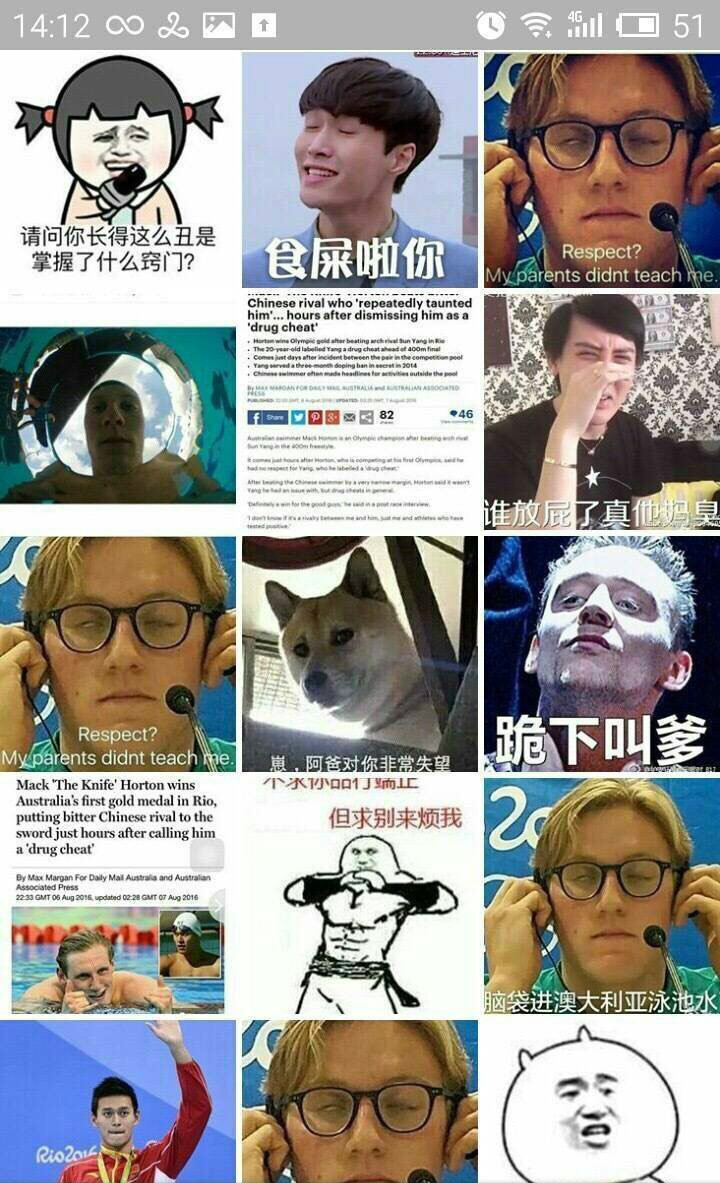 据报道,周五400米自由泳比赛结束后,霍顿面对媒体采访“直爽”地说“孙杨是个嗑药的骗子”,并表示自己不喜欢任何与兴奋剂有关联的选手。