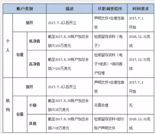 2017年12月31日前,完成对存量个人高净值账户(截至2016年12月31日金融账户加总余额超过100万美元)的尽职调查;