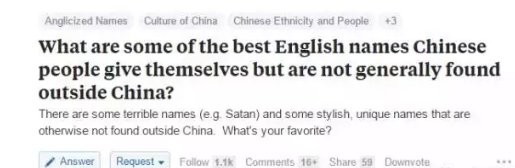之前,在著名的美版知乎Quora上就有老外发起过问题:“中国人都起过哪些奇葩的英文名?”