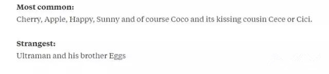 这个问题一出,便引起了大波外国网友的热烈回复。最常见的是Cherry, Apple, Happy, Sunny还有Coco,Cece和Cici。最怪异的是奥特曼,和鸡蛋…