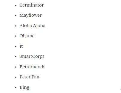 甚至有网友贴出了一张表:终结者、五月花、阿罗哈阿罗哈、奥巴马、它….