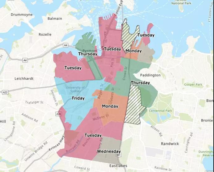 不同地区议会收垃圾的时间也不相同,以悉尼CBD为例,每周二为收垃圾日。