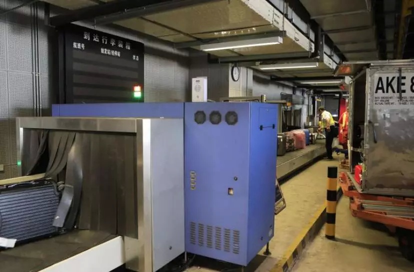 这种X光扫描机是特制的,分别安装在行李分拣转盘区域,当行李搬运工把行李搬上传送带后,就可以开始扫描,与此同时,海关工作人员可以实时通过监视屏看到过机行李的透视图。