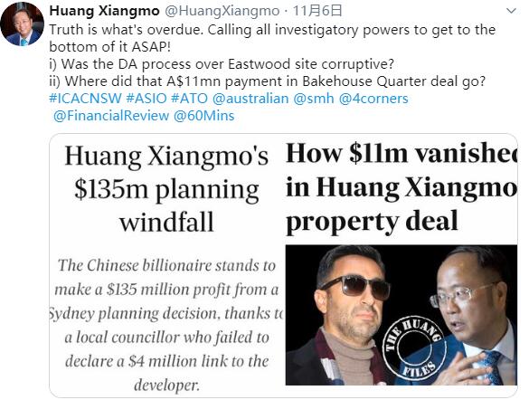 中国富商黄向墨昨日在个人推特上发文,呼吁澳洲政府调查和自己有关的两笔地产交易。