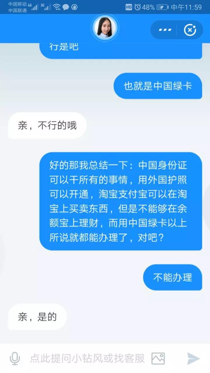 于是大失所望的笔者做了一番总结:凭中国大陆二代身份证可以依法依规做所有的事情:买买东西、余额宝理财等等。外国护照可以注册淘宝、支付宝买卖东西,但是不能够开通余额宝等理财服务。而“中国绿卡”目前连注册认证这一关都还没能实现...