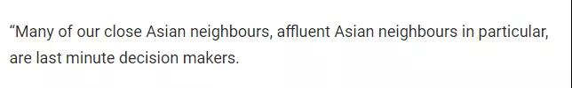 Mr Shelley更是从主观需求上解释周边亲密的亚洲邻国,尤其是富裕的亚洲邻国游客,都是 “最后一刻”型决定者。