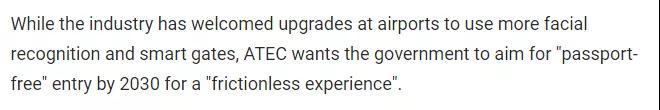 虽然APEC对机场升级使用更多面部识别和智能门表示欢迎,但ATEC希望政府到2030年可以实现“免护照”入境,让游客获得“零摩擦体验”,一路通行无阻。