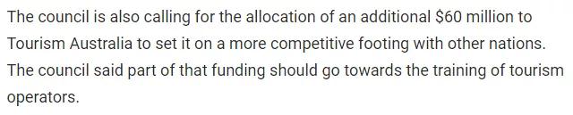 此外,APEC建议财政向澳大利亚旅游业额外拨款6000万美元,以提高在国际竞争中的旅游地位。并表示资金应用于培训旅游运营商。