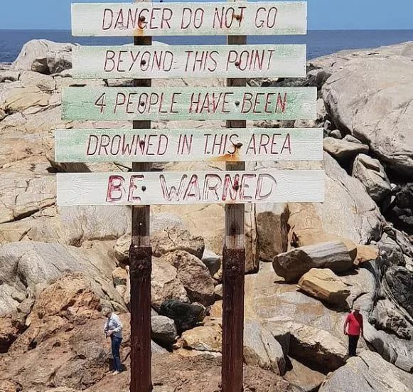海岸边隔一段距离就会有一块警示牌,警告海浪非常危险,千万不要靠近!因为曾有4名人在这里丧生。
