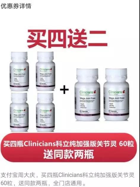 康尔佳:买四瓶Clinicians科立纯加强版关节灵送同款两瓶!买4赠2!孝敬长辈,事不宜迟啊!