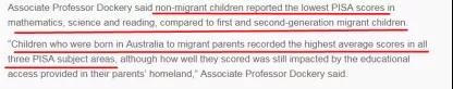“尽管移民儿童的成绩会受到父母在原籍国接受教育机会的影响,但是父母是移民的出生于澳洲的孩子在PISA所有3个科目的平均成绩都是最高的!”