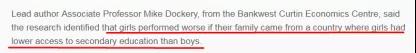 首席研究者,来自Bankwest Curtin经济中心的副教授Mike Dockery博士表示,“如果女孩的家庭来自一个女孩接受教育的机会少于男孩的国家,女孩的学习表现会更差。”