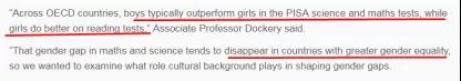 但若父母双方均来自性别平等程度更高的国家,因学生性别不同所造成的数学和科学成绩差距往往会消失,因此,他们认为文化背景在塑造性别差距方面起到了十分重要的作用。