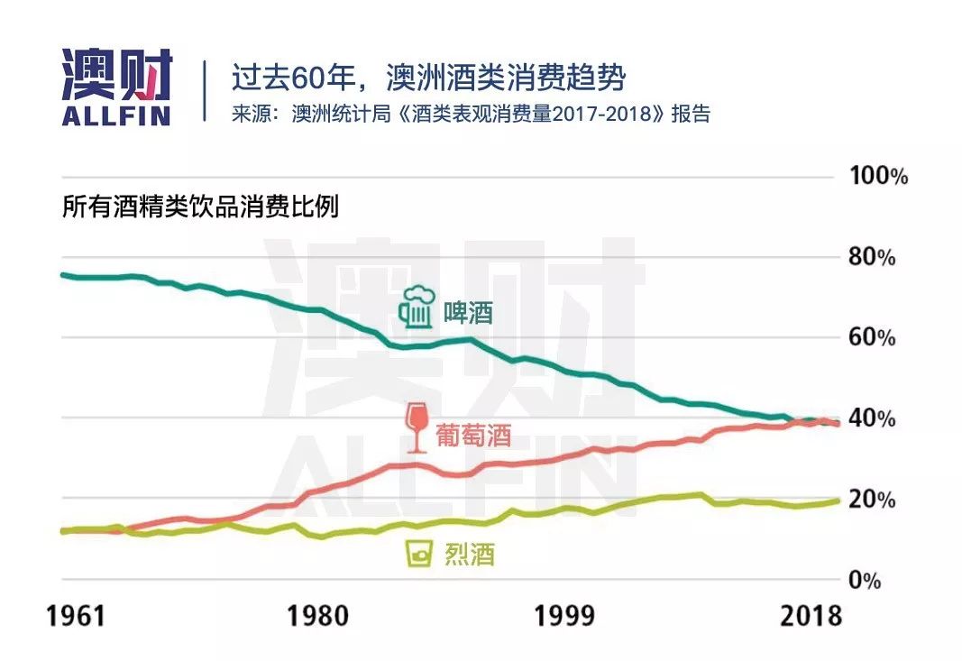 “2017 – 18年啤酒仅占据了39.0%的纯酒精消费市场,而葡萄酒的数据为38.6%。这和过去形成鲜明对比,40年前啤酒占据人均15岁及以上纯酒精消费市场的67.6%,而葡萄酒仅占比18.6%,这一变化反映了人们消费偏好随时间的变化而变化。”