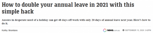 所有人都期盼着放假,再加上2020年又是极具挑战的一年,因此你一定会期待2021年能有个新的开始。据澳洲新闻集团报道,好消息是,澳人明年的休假时间有望翻倍,且不会超过上限。
