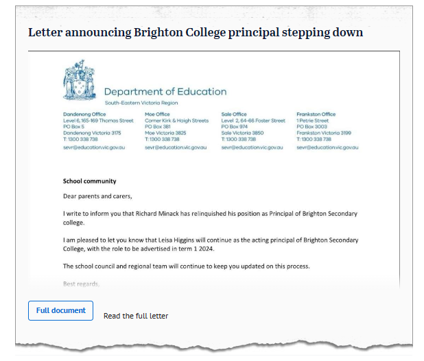 这所学校就是Brighton Secondary College,辞职的校长为 Richard Minack 。教育部区域主任 Ian Burrage 在给学校社区的一封信中,向家长通报称 Richard Minack 将离校,并表示 Leisa Higgins 将继续担任代理校长,学校将在 2024 年第一学期公布校长职位。