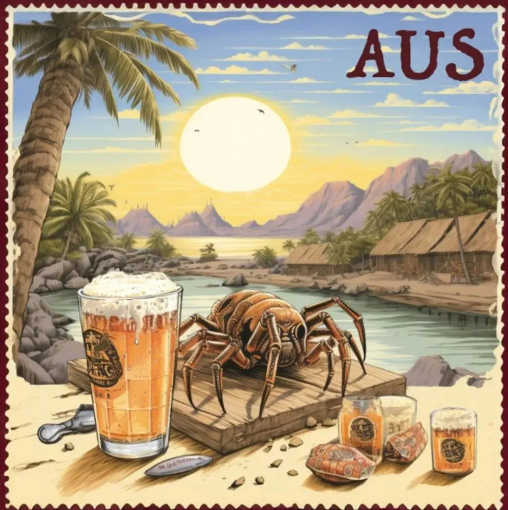 意大利邮票是一个美丽的葡萄园,上面放着一瓶红酒,希腊的邮票是桑托里尼著名的蓝顶教堂,然后是澳洲,邮票向我们的风景以及…蜘蛛致敬。邮票上展示的是带有棕榈树的海滩、山脉、一杯啤酒——这些都很准确,但是在啤酒旁边,却是一只巨大的蜘蛛。