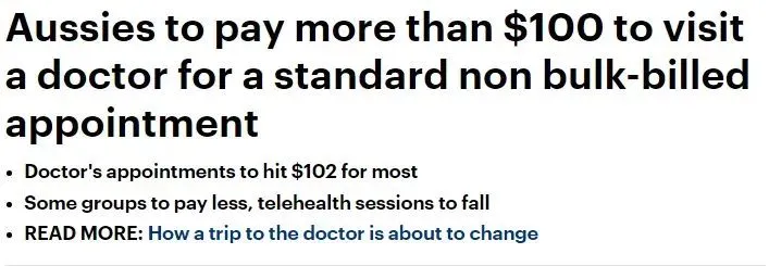 在截至7月份的一年中,全科医生的提供批量计费从88.3%骤降至80.2%,原因是许多全科医生在向病人提供批量计费时依靠41澳元的Medicare返现补贴无法支付诊所的运营成本。据了解,AMA每年都会发布一份与通货膨胀挂钩的医生建议收费清单,从11月1日起,全科医生的标准诊费将上涨至102澳元。此类咨询的Medicare将为患者补贴40.40澳元,缺口费用为60.60澳元。