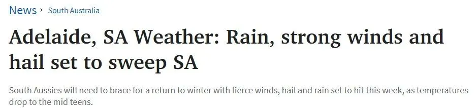 在南澳享受了一个周末的温暖天气之后,寒流将席卷而来,带来降雨、冰雹和强风。周二上午,南澳气象局向中南部海岸和东南部下海岸发布了大风警报,并向阿德莱德市区海域发布了强风警报。此外, Far West Coast, Upper West Coast, Lower West Coast, Central Coast, Spencer Gulf, Gulf St Vincent, Investigator Strait 以及 Upper South East Coast.也发布了警报。