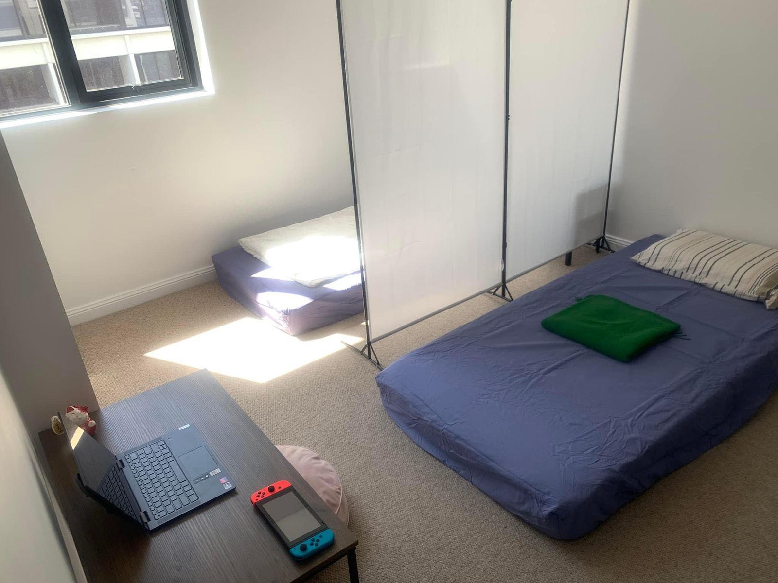 列出的图片显示,两个单人床垫躺在卧室的地板上,中间仅由一个隔板隔断,共用配有一张桌子和一个内置衣柜。