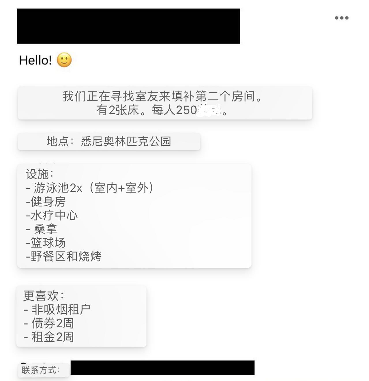 该广告本周发布到国际学生的Facebook群上,在悉尼奥林匹克公园的一个小公寓单位的房间。