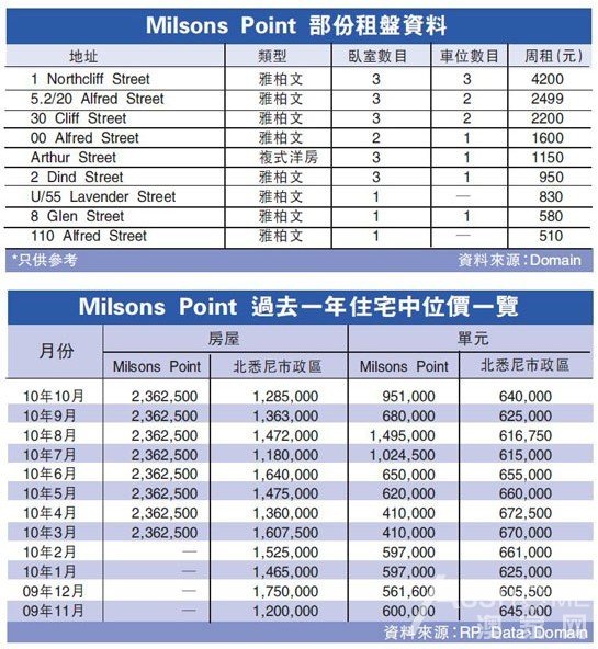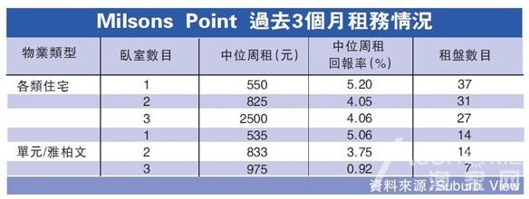 根据房地产投资网站Suburb View的资料,在Milsons Point,整体出租物业最新的中位周租为800元,而雅柏文/单元的中位周租是820元。