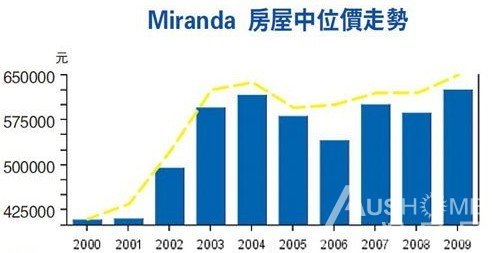 Miranda的北面是Sylvania和Sylvania Waters,东边为Caringbah、Woolooware和Cronulla,南面为Gymea Bay和Yowie Bay,而西面为Gymea和Sutherland。 Miranda区有有一座大型Westfield购物城,又有多间著名中小学校,兼且拥有Sutherland Shire市政区内最大的火车-巴士(公车)中转站。此外,从Miranda出发,前往Cronulla区的海滩都很便捷。 RP Data的资料显示,今年5月,Miranda的房屋中位价是763,825元,较Sutherland Shire市政区的782,500元低2.4%;雅柏文/单元的中位价为460,500元,与Sutherland Shire市政区的448,000元相比高出2.8%。 按年度计算,Miranda的中位屋价在2007年上升11.1%,翌年轻微回吐2.4%,到去年又反弹6.7%;于单元中位价在07年微升0.5%后,亦在08年下调4.6%,到去年显著回升12.4%。过去10年,Miranda的中位屋价大部份时间落后于Sutherland Shire市政区。 今年来截至5月为止,Miranda的中位屋价累计涨16%,而单元中位价累积升7.3%。 澳洲物业监察”(APM)的数据显示,在去年,Miranda共卖出209间房屋,较05年多63间;而去年底之中位价为557,500元,较05年的568,500元跌1.9%。在未来10年里,Miranda的中位屋价预可望每年平均升值4%,在2019年升至863,351元。 拍卖成功率逾80% 公寓/单元在去年卖出255套单位,较05年多出差不多40套;去年底中位价为377,500元,较05年的355,000元高出6.3%。根据推测,中位价可望在10年里每年平均上升4%,到2019年达到558,848元。 另据APM的调查,在截至今年4月的12个月里,Miranda的房屋拍卖成功率高达83%,高于Sutherland Shire市政区的71%。至于Miranda的单元拍卖成功率为63%,不及Sutherland Shire市政区的71%。