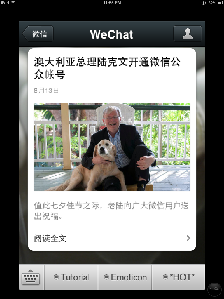 昨天晚上,澳洲的微信用户收到了系统发送的一条信息。这条信息以“澳大利亚总理陆克文开通微信公众账号”为标题,里面还有一段链接到Youtube的视频。 陆克文在这段视频中不但用中文表达了自己希望通过微信这个平台和民众加强联系的愿望,还表示“祝大家七夕节快乐,有情人终成眷属”。截止到今天上午,这段 视频的点阅率已经有540多次。