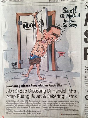 这份具有中产阶级意味的报纸名为《人民自由报》(Rakyat Merdeka)。艾伯特在漫画中撬开一扇写着“印尼”的门,并鬼鬼祟祟地往内看。与此同时,漫画中的艾伯特甚至还流着口水,一边汗流浃背地自慰,一边呻吟:“我的天啊,印尼……太性感。”这幅漫画暗示澳洲监听印尼总统苏西洛(Susilo Bambang Yudhoyono)、总统妻子及总统的密友圈。