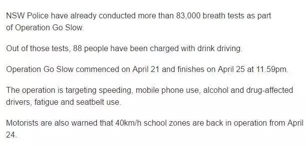 从上周五(4月21日)凌晨开始在包括ANZAC Day在内的长周末这几天,新州警方全体出动进行的Operation Go Slow行动到前天(4月25日)午夜正式结束。