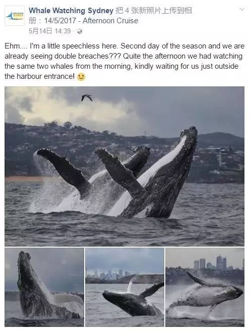 组织游客前去观鲸的Whale Watching Sydney在脸书上也难以抑制他们的兴奋之情,因为他们也没有想到观鲸季才刚刚开始,就能出现如此难得的画面。