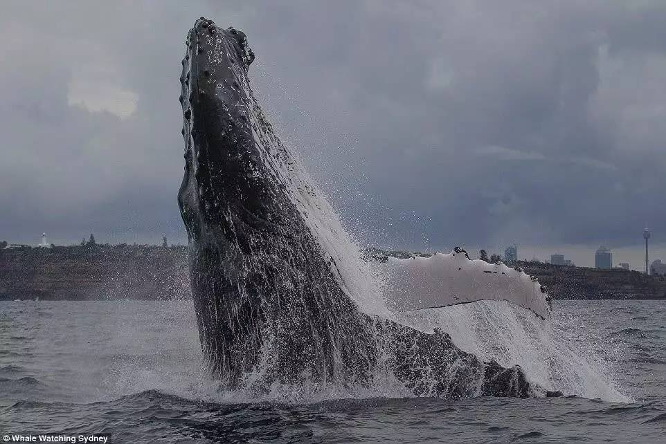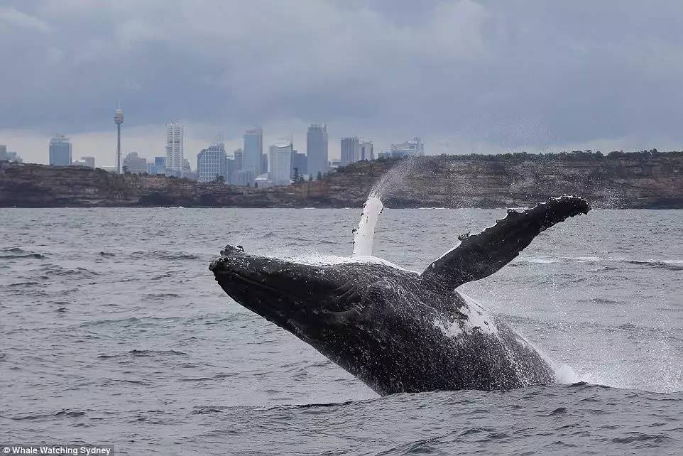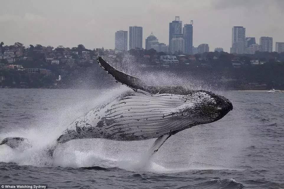 眼前是翻出水面的鲸鱼和它们搅动出的巨大浪花,背面是熟悉的city景观——其中一些游客用相机拍下了鲸鱼出水的一幕幕场景。