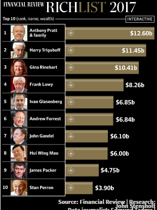 排在富豪榜第一位的是澳洲Visy Industries和美国Pratt Industries包装公司的老板Anthony Pratt,身价达126亿澳元。这次榜单中有3人的身价超过100亿,是34年来的第一次,另外两位分别是澳房地产大亨Harry Triguboff和澳矿业大亨Gina Rinehart,身价分别为114.5亿和104.1亿。