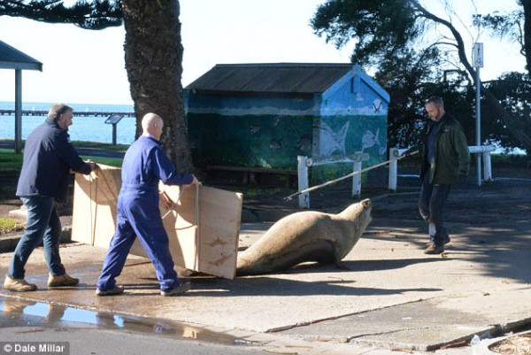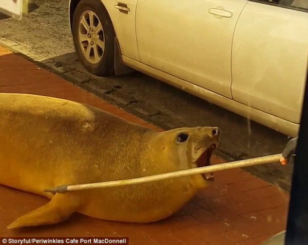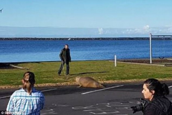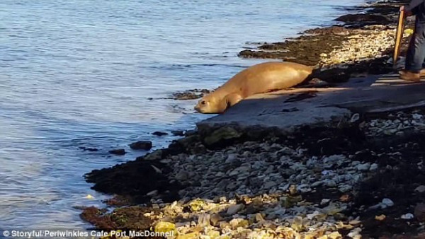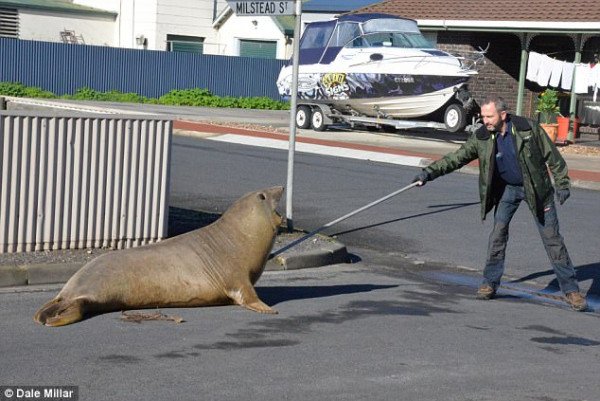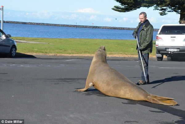 第二天Dale Millar拿着一根杆子,用自己当诱饵,把这头海狮一步步引诱回海里。当地一家咖啡店的老板称,当时有近40多个人在围观这一幕,要知道这个小镇的人口也不过就600人,不过幸运的是最终这头海狮安全地回到了海里。